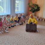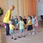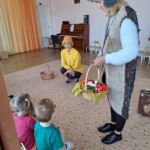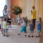 Rudens Vīriņš aicināja bērnus doties uz mežu lasīt sēnes. Pa ceļam bija jāpārvar dažādi šķēršļi – jāpārkāpj pāri baļķiem, jāizlien cauri zariem, jāapiet apkārt celmiem.